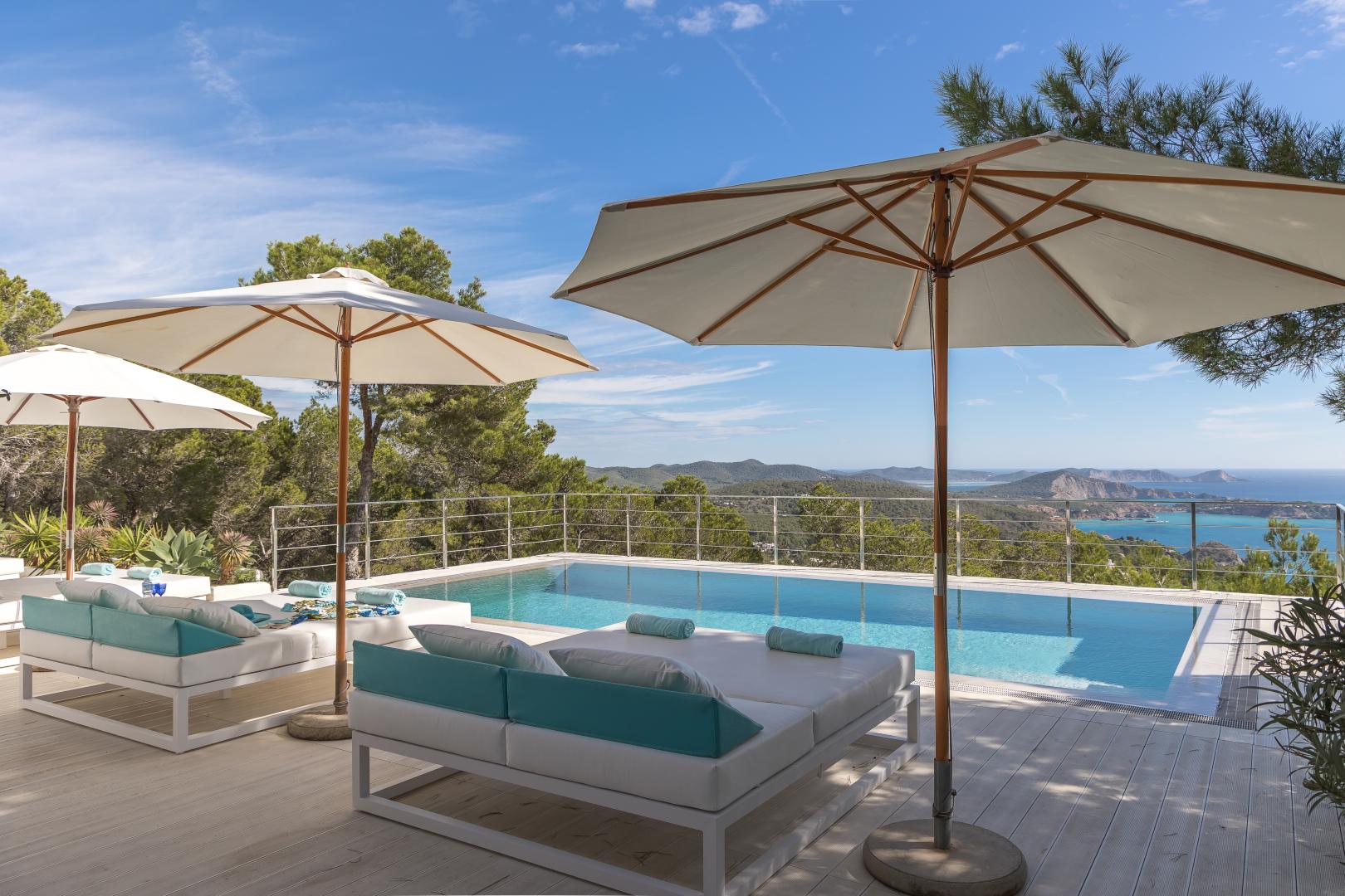 200 m² modern terrace with white wood and big pool of 9 x 4m; spectacular sea views to Formentera, Salines and Cala Jondal.