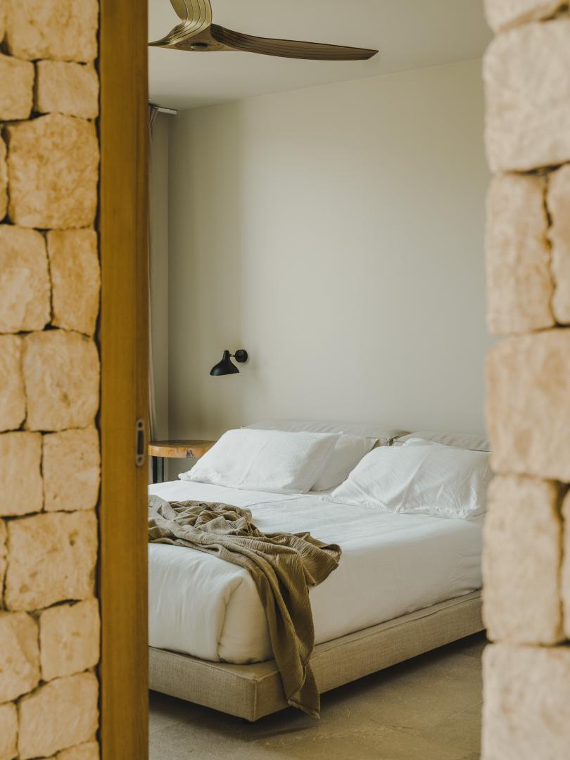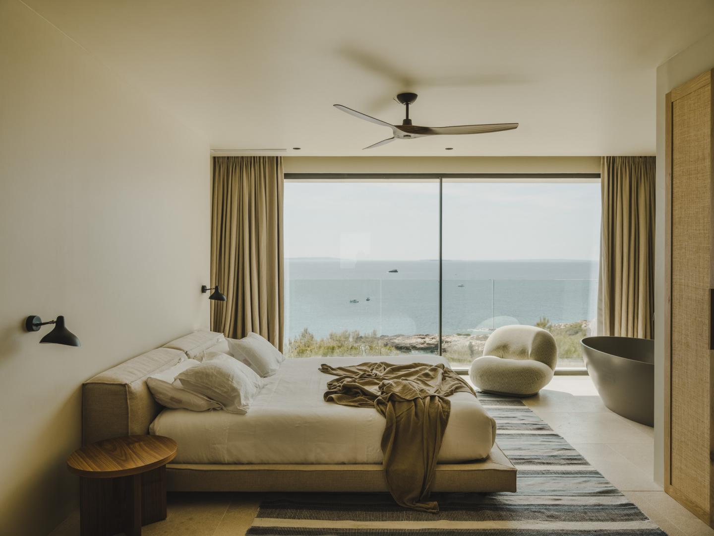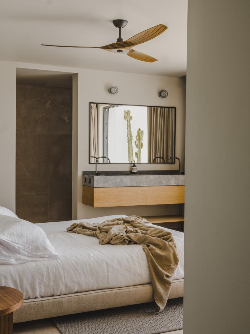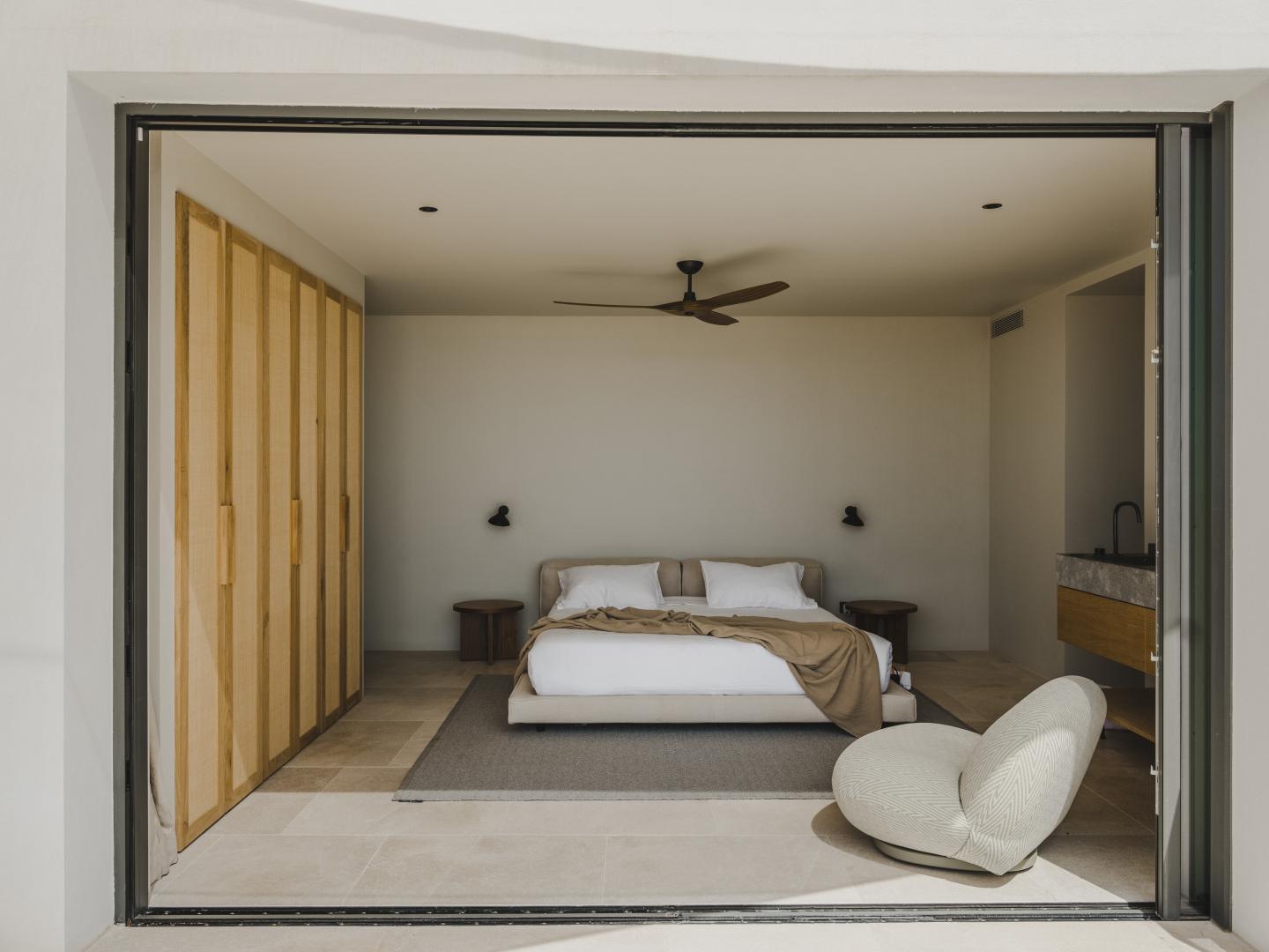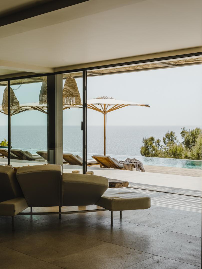 Natural stone flooring, Cocoon bathrooms with Aesop amenities, Divani bedding and furniture, Tribu outdoor furnishings, and carefully curated designer lighting create a warm, intimate atmosphere at any time of day.
