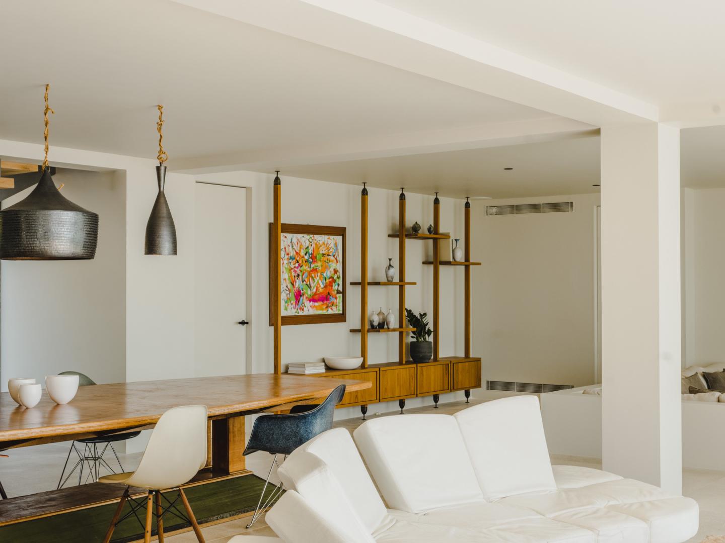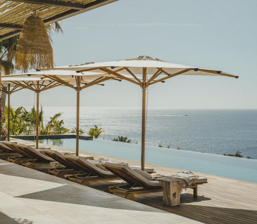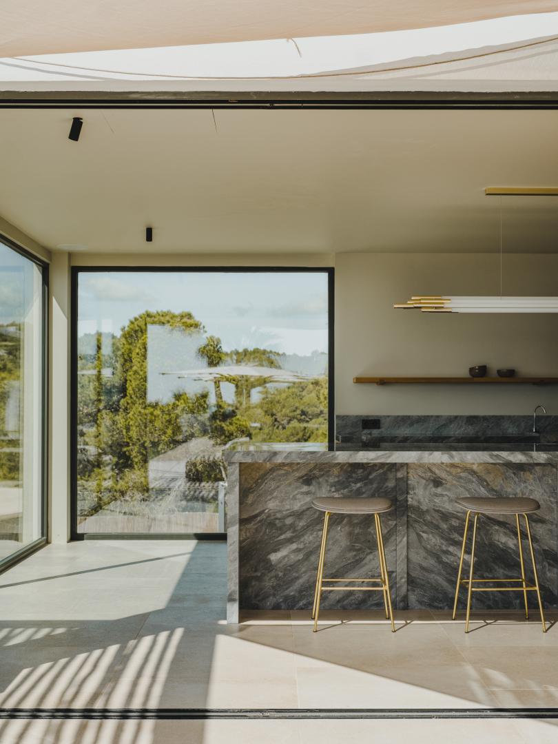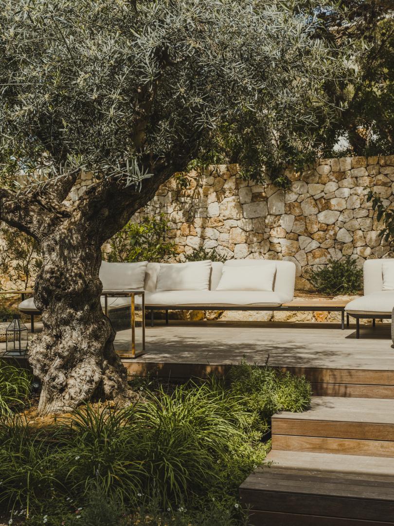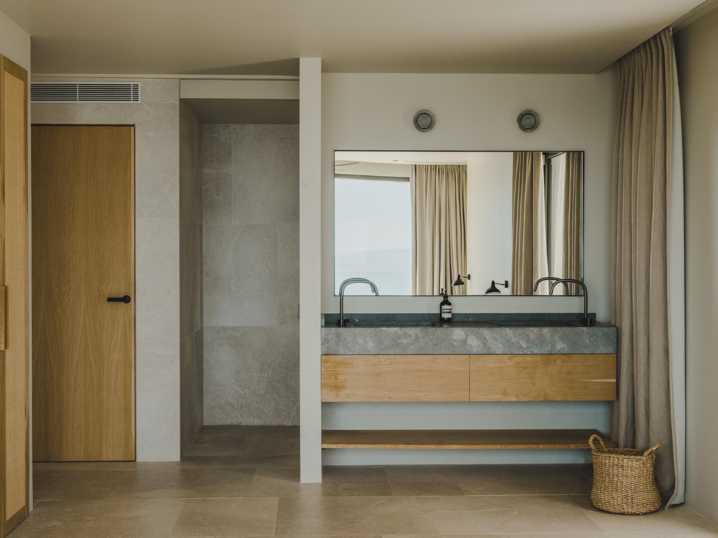 Natural stone flooring, Cocoon bathrooms with Aesop amenities, Divani bedding and furniture, Tribu outdoor furnishings, and carefully curated designer lighting create a warm, intimate atmosphere at any time of day.